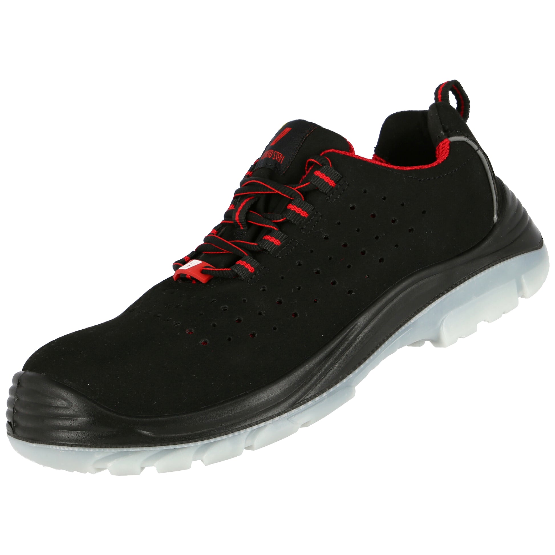 NITRAS MICRO STEP, safety low shoes, S1 P, durable microfiber, black (color code: 1000), durable PU / TPU outsole, black / transparent, fiberglass toe cap, puncture-resistant textile midsole, metal-free, high-quality COMFORT STEP insole, ergonomically shaped, attractive design, best possible slip resistance (SRC), width 11, reflective strips on the heel, heel lining for easy to put on and take off and heel reinforcement made of robust microfiber, DGUV rule 112-191 tested, type 1, type 2, ESD capable, PPE risk category II