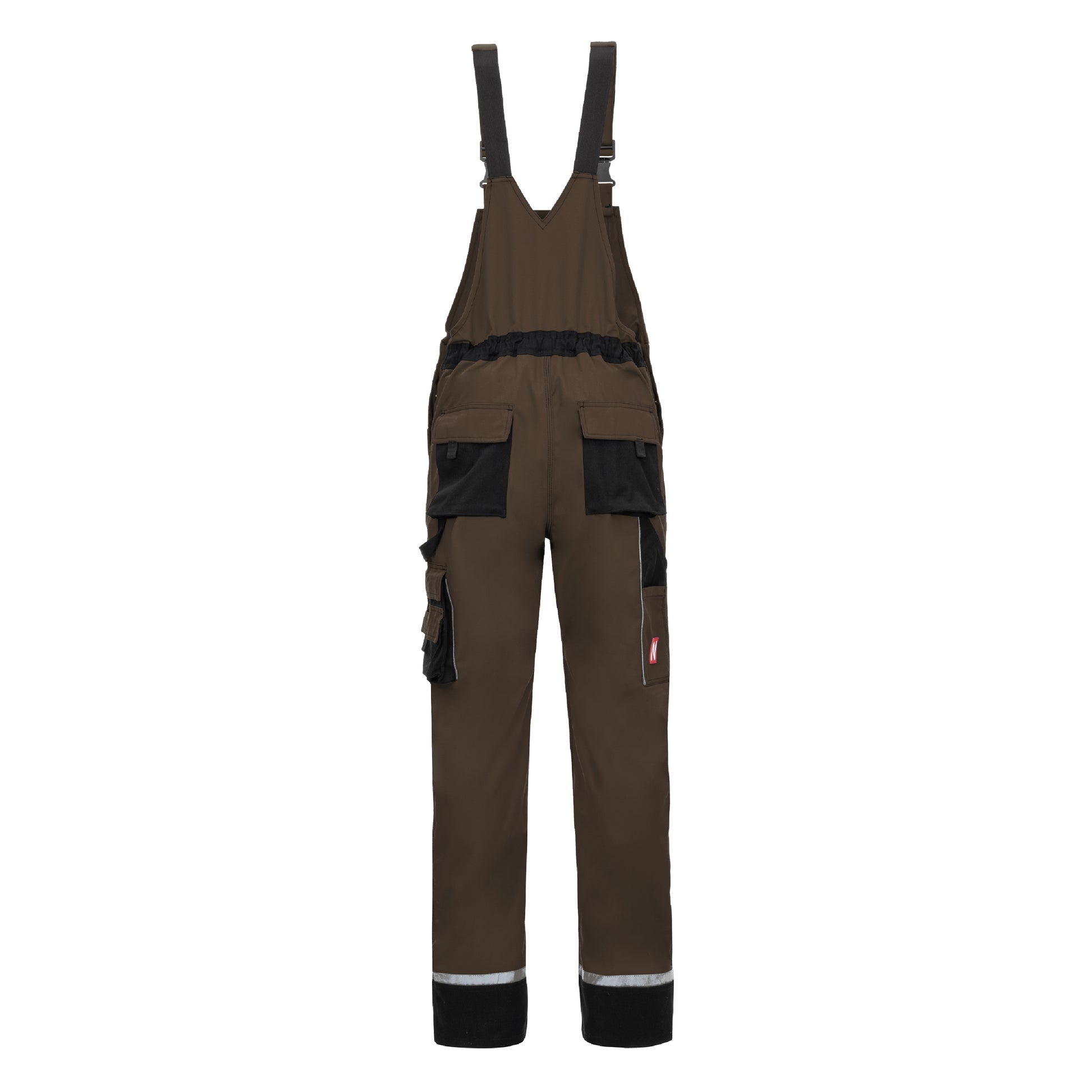 The NITRAS MOTION TEX PLUS dungarees in brown/black (color code: 5010) offer a high level of comfort with their breathable material and stretchy waistband. The canvas reinforcements on the leg, knee and back pockets as well as on the outer bib pocket and the leg cuffs ensure additional durability. Robust triple seams and reflective elements improve visibility. Equipped with practical extras such as thigh pockets with flaps, ruler pocket, inner bib pocket with YKK zipper and knee pockets for padding, these trousers are the ideal companion for demanding work. The high-quality workmanship is rounded off by the OEKO-TEX STANDARD 100® and the optionally available knee protection 76K (EN 14404).